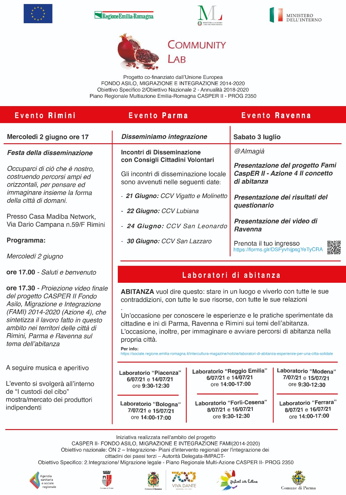 Con l’obiettivo di promuovere l’integrazione dei cittadini stranieri e la rigenerazione di uno spazio fisico, i Laboratori di abitanza sono una iniziativa ideata dalla Regione Emilia-Romagna in collaborazione con i Comuni di Parma, Rimini e Ravenna nell’ambito del progetto multi-azione FAMI CASPER II.